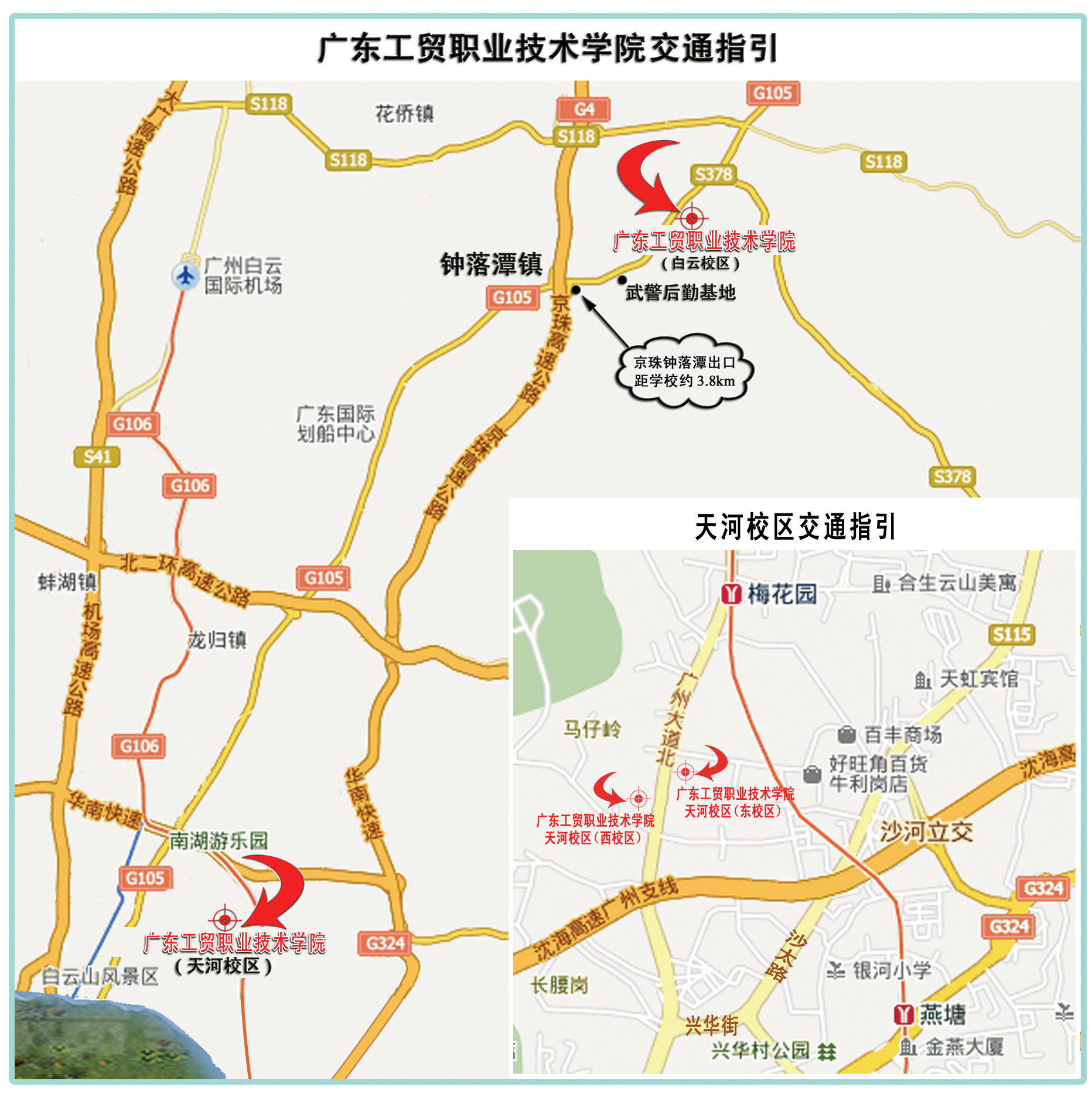 交通指南(天河校区) 乘坐公交车:火车站可乘862路到梅园新村站下;火车东站可乘坐804、804A、804B路到梅园新村站下;天河客运站可乘坐30、84A、84、235、884路到军体院站下,到马路对面的军体院站转乘804、804A、804B路到梅园新村站下;市区可乘坐16、56、179、B6、560、804、836、833、862、219路到梅园新村站下。 乘坐地铁:火车站乘坐二路线到嘉禾望岗站转乘三号线到梅花园站D出口出;火车东站乘坐三号线到梅花园站D出口出;芳村汽车客运站乘坐一号线到广州东站转乘三号线到梅花园站D出口出。 | | 交通指南(白云校区) 乘坐广从1~11线或广从专线车(购买到“新和”站车票,在“工贸学院”正门下车): 广从1线:在广州市汽车站乘车 广从2线:在芳村汽车站乘车 广从3线:在罗冲围汽车站乘车 广从4线:在天河客运站乘车 广从5线:在广州火车东站客运站乘车 广从6线:在东圃客运站乘车 广从7线:在黄埔客运站乘车 广从8线:在广园汽车站乘车 广从9线:在窖口汽车站乘车 广从10线:在越秀南汽车站乘车 广从11线:在海珠汽车站乘车 广从专线:在市桥汽车站、番禺汽车站乘车 乘坐地铁后接驳公交车或乘坐公交车: 1、从广州火车站或火车南站坐地铁2号线、广州火车东站或白云机场坐地铁3号线到嘉禾望岗站A出口,走90米到地铁嘉禾望岗站(公交站),然后乘坐804路(坐9站)到沙亭岗村口站转乘501路(坐13站)到湴湖站下;或乘坐804路(坐20站)到钟落潭文化广场总站转乘725路(坐4站)到湴湖站下。 2、在广州火车东站公交站场乘坐501路到湴(bàn)湖站下(路程远,需时较长)。 自驾车:路线指引:从华南快速或北二环高速转入京珠高速从钟落潭出口,沿105国道往从化方向约3.8公里处,在高速路出口处和校门口均有大型路牌明显标示。
