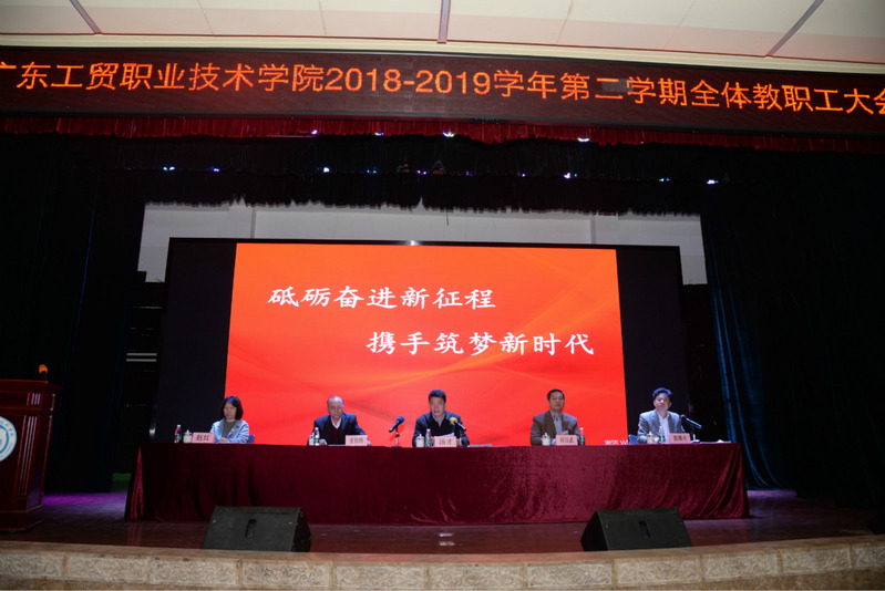 汤才同志作了题为“砥砺奋进新征程,携手筑梦新时代”的讲话。汤才同志指出,2018年,我们认真学习贯彻习近平新时代中国特色社会主义思想、党的十九大精神和习近平总书记重要讲话和重要批示精神,以政治建设为统领,加强了党对学校工作的全面领导;坚持“立德树人”,构建“一枢三联,覆盖全体”思政工作管理体系;层层压实党建责任,以党建引领中心工作,主动适应职业教育改革发展的新形势,积极服务广东经济社会的新需求,学校各项事业保持良好发展态势。汤才同志对本学期的工作提出了具体要求,强调要强化创新理论武装,提高政治站位,加强党对学校各项事业的全面坚强领导;要牢牢掌握意识形态工作主导权,确保政治安全和意识形态安全;要坚持以立德树人为根本,将思想政治工作落实落细落地;要全面从严管党治党,营造风清气正的发展环境;要加强学习、转变观念,补齐短板,推动学校工作高质量发展。最后,汤才同志强调,我们要在以习近平同志为核心的党中央坚强领导下,高举习近平新时代中国特色社会主义思想伟大旗帜,牢固树立“四个意识”,不断坚定“四个自信”,坚决维护习近平总书记的核心地位、坚决维护以习近平同志为核心的党中央权威和集中统一领导,抓住国家大力发展职业教育这一历史机遇,鼓足干劲,奋发有为,闻鸡起舞,日夜兼程,一棒接一棒接续奋斗,为实现工贸教育事业高质量发展作出更大贡献。