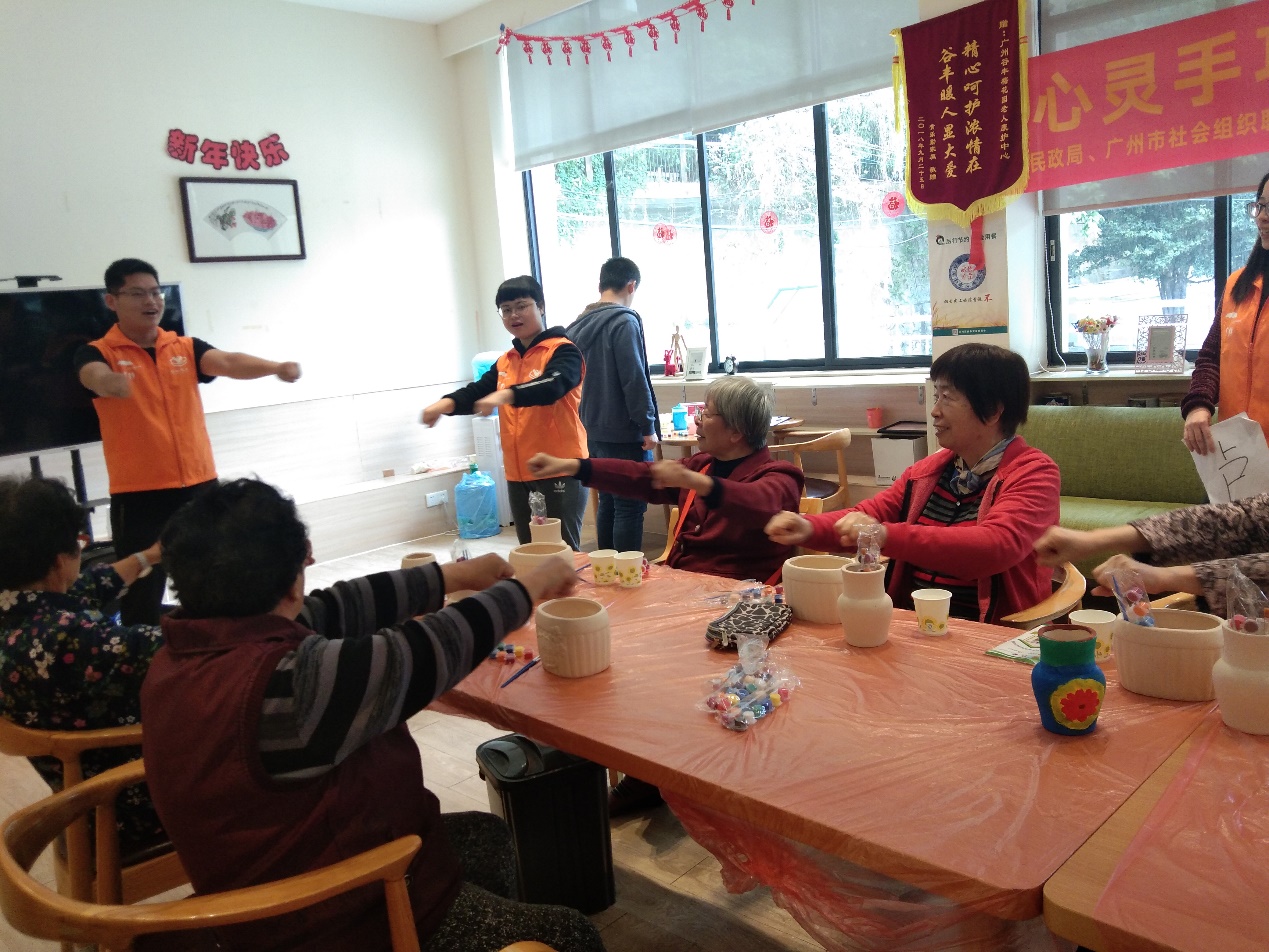 活动一开始,志愿者就开始教长者们做可以有效预防脑部疾病的“手指操”。教完手指操后,就开始了花盆的绘制。过程中,志愿者帮长者们标记长者看不清的图案、帮长者洗笔换水、陪长者聊天,协助长者们完成一个个花盆的绘制。