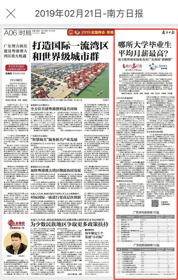 2019年2月21日,我校荣登《南方日报》广东高职薪酬榜十强,位列全省第九。文章“哪所大学毕业生平均月薪最高?南方教育智库独家发布广东高校‘薪酬榜’”全文如下,可点击链接查看:http://epaper.southcn.com/nfdaily/html/2019-02/21/content_7781484.htm