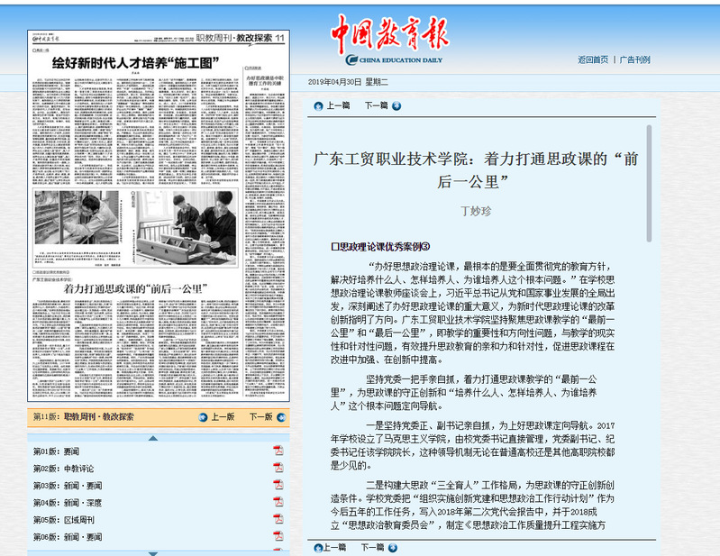 □思政理论课优秀案例③ “办好思想政治理论课,最根本的是要全面贯彻党的教育方针,解决好培养什么人、怎样培养人、为谁培养人这个根本问题。”在学校思想政治理论课教师座谈会上,习近平总书记从党和国家事业发展的全局出发,深刻阐述了办好思政理论课的重大意义,为新时代思政理论课的改革创新指明了方向。100%精准出码规律资料网站坚持聚焦思政课教学的“最前一公里”和“最后一公里”,即教学的重要性和方向性问题,与教学的现实性和针对性问题,有效提升思政教育的亲和力和针对性,促进思政课程在改进中加强、在创新中提高。 坚持党委一把手亲自抓,着力打通思政课教学的“最前一公里”,为思政课的守正创新和“培养什么人、怎样培养人、为谁培养人”这个根本问题导向导航。 一是坚持党委正、副书记亲自抓,为上好思政课定向导航。2017年学校设立了马克思主义学院,由校党委书记直接管理,党委副书记、纪委书记任该学院院长,这种领导机制无论在普通高校还是其他高职院校都是少见的。 二是构建大思政“三全育人”工作格局,为思政课的守正创新创造条件。学校党委把“组织实施创新党建和思想政治工作行动计划”作为今后五年的工作任务,写入2018年第二次党代会报告中,并于2018成立“思想政治教育委员会”,制定《思想政治工作质量提升工程实施方案》,开展“构建德育体系思想政治工作调研活动”,逐步建立起一支党委统一领导、党政齐抓共管、有关部门各负其责、全校协同配合的大思政“三全育人”工作格局,为理直气壮上好思政课奠定了良好基础。 三是发挥学校党委书记和校长思政第一课的头雁效应,为立德树人树立旗帜。学校高度重视、高标准严要求开好校党委书记和校长第一课,由党委办公室和马克思主义学院牵头组织各个二级学院党总支书记和院长第一课的集体备课,确保正确的政治方向和价值导向。 四是实施课程思政方案,为上好思政课固本强基。学校颁发《课程思政实施方案》,挖掘“课程思政元素”,发挥专业课教师“守好一段渠,种好责任田”的责任,并鼓励党员教师率先开展立项建设,使各类课程与思政理论课同向同行,形成协同效应的大思政“三全育人”工作格局,为思政课建设强基固本。 切实推进习近平新时代中国特色社会主义思想“五进”工作,聚焦思政课教学的“最后一公里”,推动思政课与习近平新时代中国特色社会主义思想的学习和教学深度融合。 一是形成“三位一体”的教学模块。习近平总书记对思政课程改革创新提出:“要坚持政治性和学理性相统一,以透彻的学理分析回应学生,以彻底的思想理论说服学生,用真理的强大力量引导学生。”在这方面,学校要求教师要进一步加强学习、理解和研究,要敢转化、会转化、充分转化,课堂讲授时不能照本宣科,要善于将党的十九大精神,特别是习近平新时代中国特色社会主义思想的理论体系这些最新成果“切实转化为教学的学理,转化为教学的方法论,转化为教师在教学中的话语体系”,将思政第一课堂、融媒体教育、实践教育结合起来,形成了“三位一体”的教学模块。其中,思政第一课堂上,除教师授课外,还通过采用个人演讲、情景剧、辩论、研究展示、社会调查等灵活多样的形式,杜绝“我讲你听”“我说你做”的传统课堂和“以讲为主”“以考为准”的传统教学模式,不断提高教学质量和学生获得感。同时,广泛利用传统媒体和新媒体,在校园报纸杂志、微信微博、校园网上制作和发布各类思政教育的文章,并在全校范围内开展关于社会主义核心价值观的微视频比赛,根据选题由学生们自编、自导、自演能体现社会主义核心价值观相关内容的微视频,并结合网站、新媒体进行发布宣传评比。此外,还结合相关讲话精神或节日,带领学生到社会实践基地或相关地点进行实地考察。 二是坚持围绕中心,服务大局,推动思政课与习近平新时代中国特色社会主义思想的学习和教学深度融合。根据每个时间节点的大事和学校党委中心工作,结合“学习贯彻全国教育大会精神”“学习贯彻习近平总书记视察广东重要讲话精神”“庆祝改革开放40周年”等中心任务,及时把习近平新时代中国特色社会主义思想这一马克思主义中国化的最新成果及时有效融入课程,既强化思想政治理论课教育主阵地意识形态宣传作用,更使思政课与党的中心工作有机融合、有效渗透、互相促进,推动思政课与习近平新时代中国特色社会主义思想的学习和教学深度融合。 三是打造一个“无处不在”的思政教育团队。学校党委高度重视思想政治教育队伍的建设,想方设法在深度、广度以及覆盖面上不断加强思政教育团队建设。一支队伍钻得“深”,学校党委通过严控选聘关口,强化政治学习,加强支部建设,落实教育部部长陈宝生提出的建设师德师风“十项准则”和学校《师德规范》等制度,把政治和师德标准放首位,不断提升思政课教师的政治站位,并通过加强师资培训、教学创新、课堂监督、教研改革力度,不断提升思政课教师的能力和水平。十支队伍做得“广”,学校组建了包括学校党委委员、各基层党组织书记、党员教授、辅导员、班主任、学生党员骨干等在内的十支宣讲队伍,通过课堂思政、座谈讨论、分享交流、知识竞赛等形式,组织宣讲习近平新时