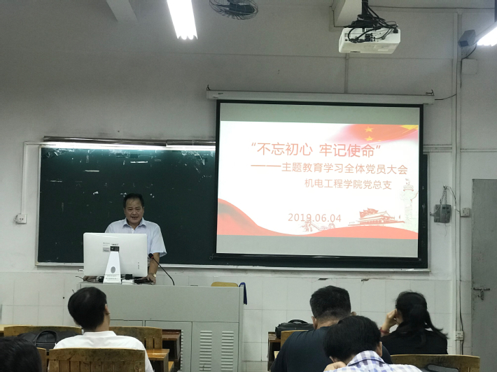 为中国人民谋幸福,为中华民族谋复兴,是中国共产党人的初心和使命。在近日召开的“不忘初心、牢记使命”主题教育工作会议上,习近平总书记发表重要讲话,深刻阐述了开展主题教育的重大意义,深刻阐明了主题教育的目标要求和重点措施,对开展主题教育提出了明确要求。2019年6月4日机电工程学院党总支在天河校区东区教学楼102召开组织生活,主题是学习习近平总书记在“不忘初心、牢记使命”主题教育工作会议上的讲话精神,出席会议的是机电工程学院党总支全体教师党员。本次会议由机电工程学院党总支书记邵超城主持。