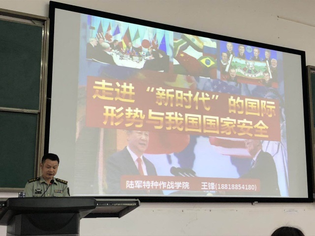 首先,王锋以“《走进“新时代”的国际形势与我国国家安全》”为主题,详细讲解了基础国防知识、当今国家安全形势与国际形势,公民国防义务与权利,如何做新时代强国强军的奋斗者等。动员广大青年学生踊跃应征入伍,到部队建功立业,报效祖国,做新时代强国强军的奋斗者。