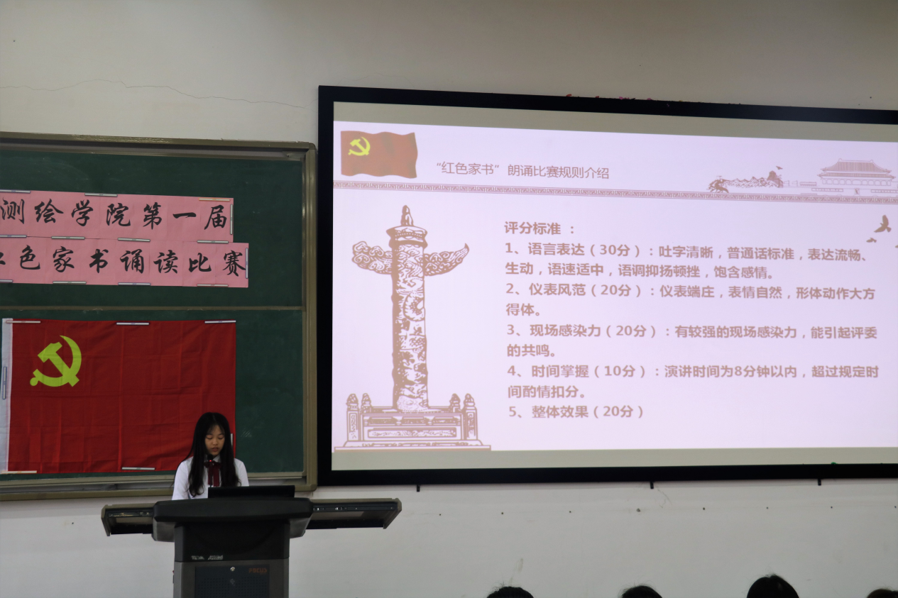 2019年6月11日下午,测绘遥感信息学院党总支在白云校区2-305组织开展第一届“红色家书”诵读比赛,由测绘遥感信息学院学生第一、第二党支部及2017、2018级各班级选送作品参加比赛,测绘遥感信息学院党总支副书记李元、学生第一党支部书记张玉荷、学生第一党支部纪检委员吴笛、学生第二党支部组织兼宣传委员刘楚泽、学生第二党支部纪检委员刘汝强出席了本次比赛,并担任评委。
