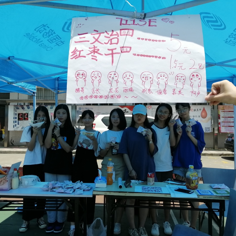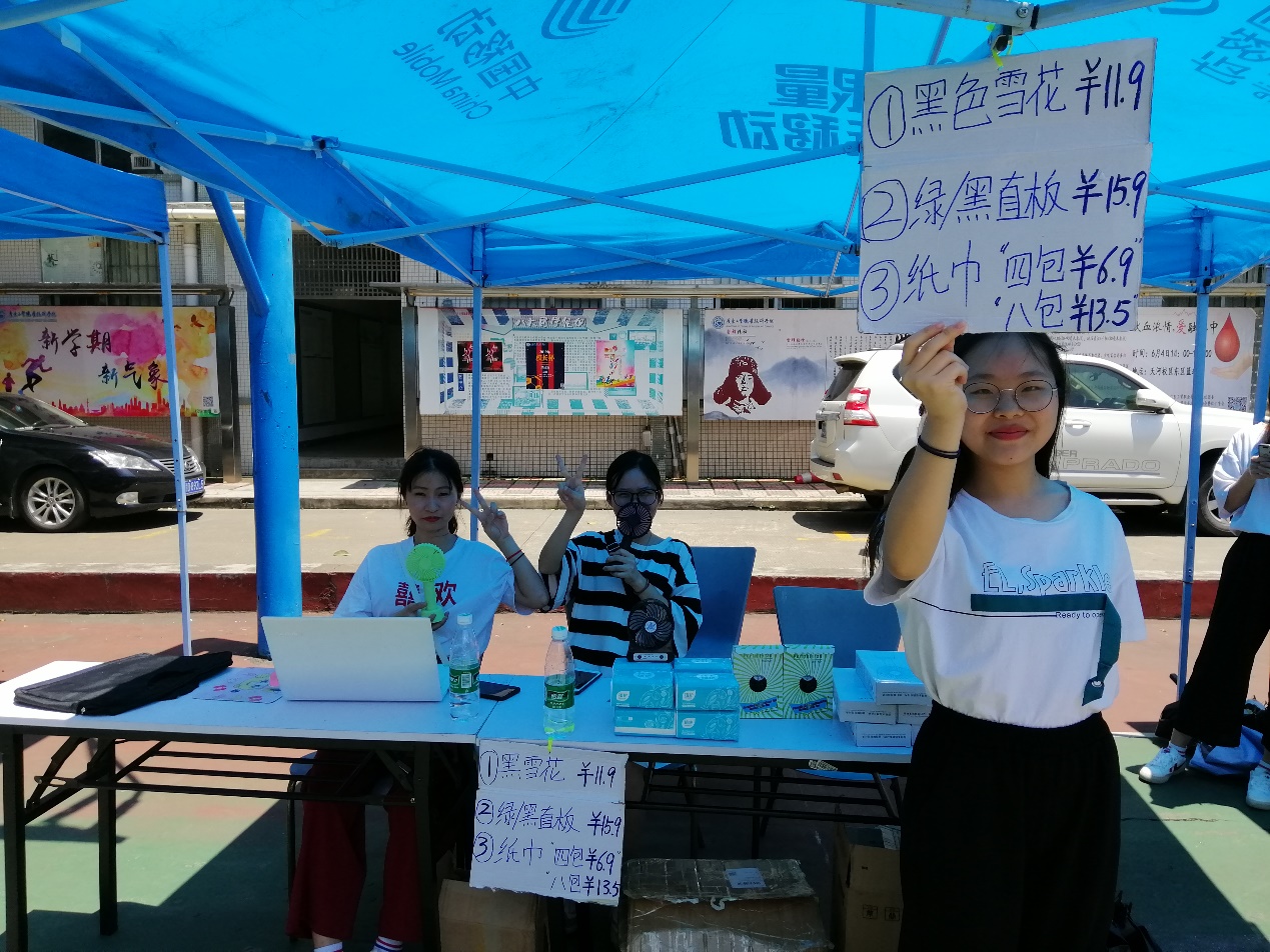 参与此次实践活动的商品可谓是琳琅满目,除了有各种各样的常见物品--水果冰、水果凉粉、携带式小风扇等,还有一些是与学生专业相关的物品,比如说来自18数艺1班的团支书林芝青带来了自己的亲笔力作--水彩贝壳画、水彩石头画和水彩木头画,这些极具有美感的作品立即吸引了无数的眼球,购买者称赞不绝。