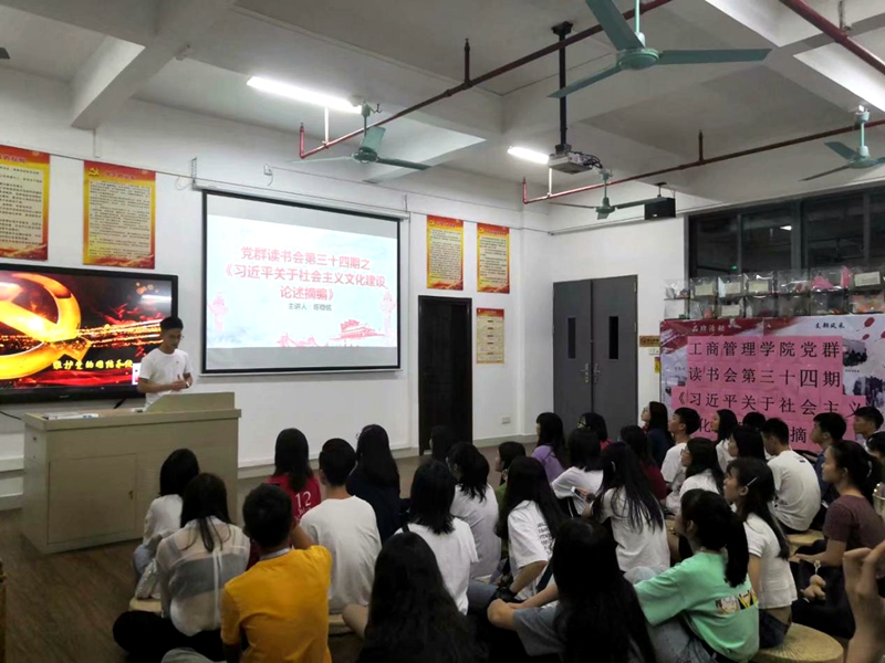 为深入学习贯彻习近平新时代中国特色社会主义思想,建设“三型”党支部,创新组织生活模式,201992919:00,工商管理学院在实训楼514党员活动室以读书沙龙形式开展第三十四期读书会,通读学习《习近平关于社会主义文化建设论述摘编》,学生党员、入党积极分子共40余人参加。