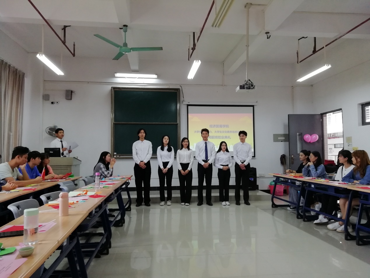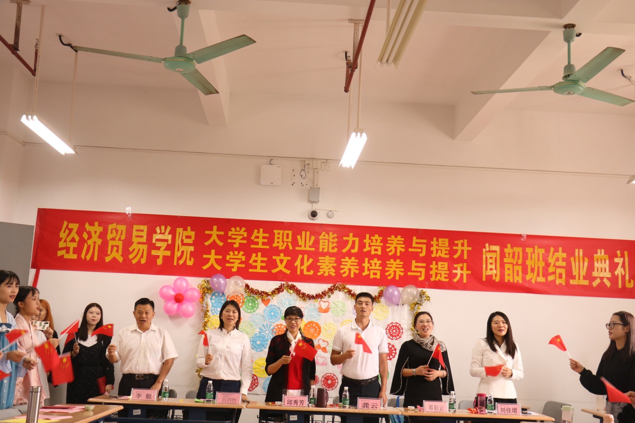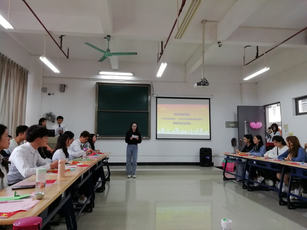 20191031日下午,经济贸易学院“闻韶班”结业典礼仪式在明德楼1-514正式拉开了序幕,出席活动的有经济贸易学院院长邱秀芳、党总支副书记龚云、办公室主任邓彩云以及骨干教师李艇、刘佳珺,出席典礼的还有广州雇者品牌咨询有限公司高级培训主管冯玥怡女士以及闻韶班52名同学。