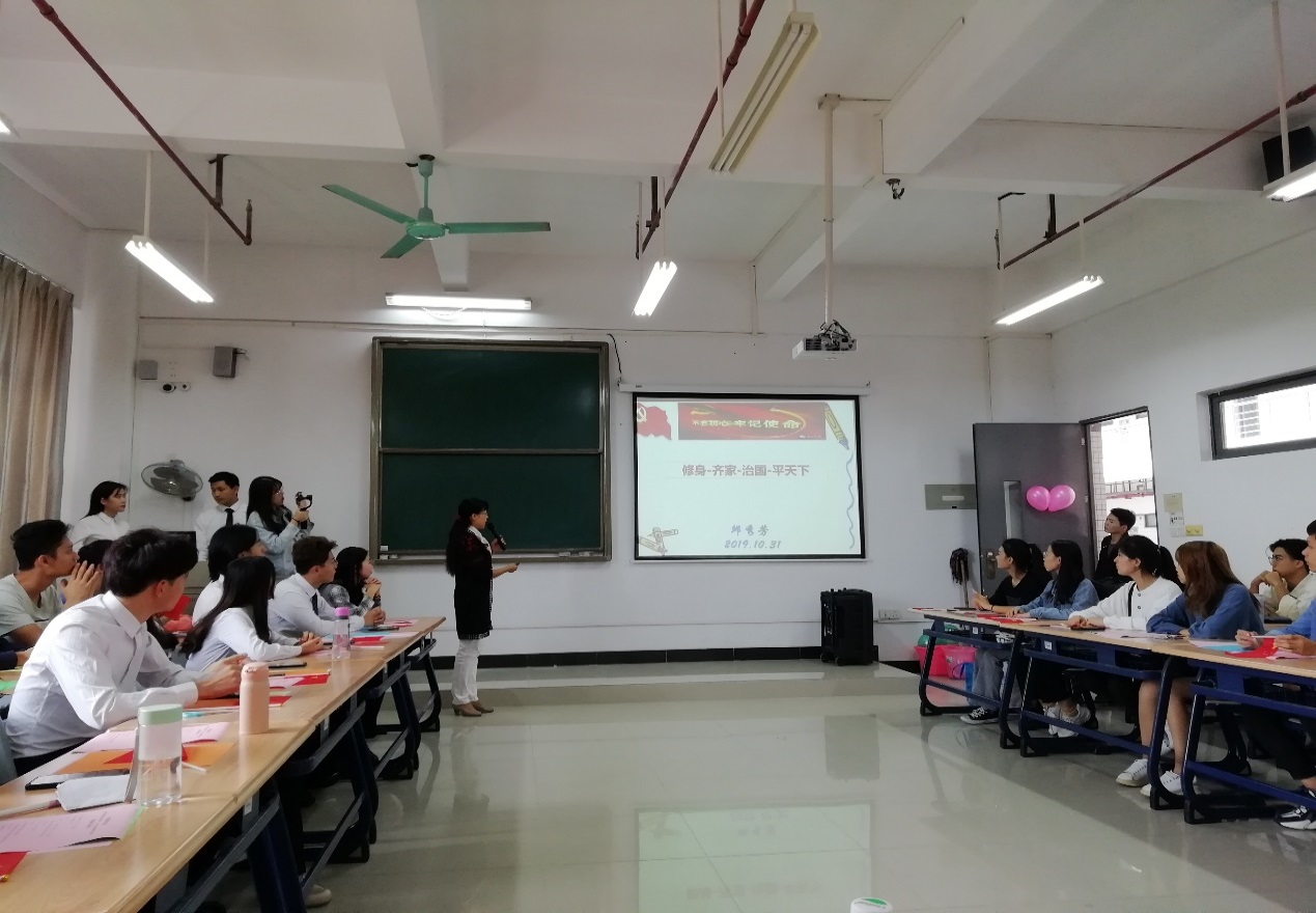 邱秀芳以“修身、齐家、治国、平天下”为主题,引用习近平主席的话“青年一代有理想,有担当,国家就有前途,民族就有希望,实现我们的发展目标就有源源不断的强大力量。”启发同学们珍惜当下在大学的美好时光,养成平时热爱看书的习惯,努力获取知识,提升自己的职业技能,培养良好的文化素养,不辜负青春韶华,为实现中国梦而奋斗。