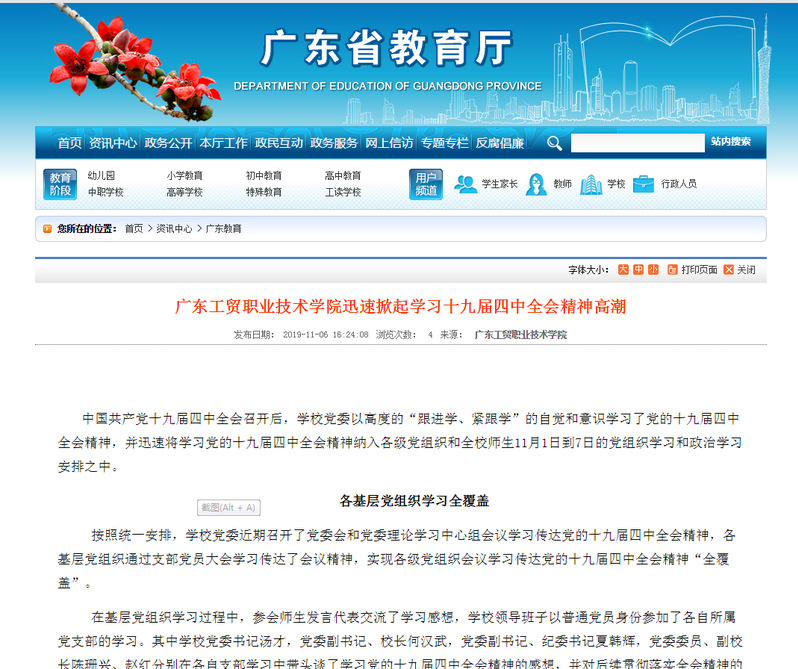 2019年11月7日,广东省教育厅主页网刊登文章,报道我校迅速掀起学习党的十九届四中全会精神高潮。