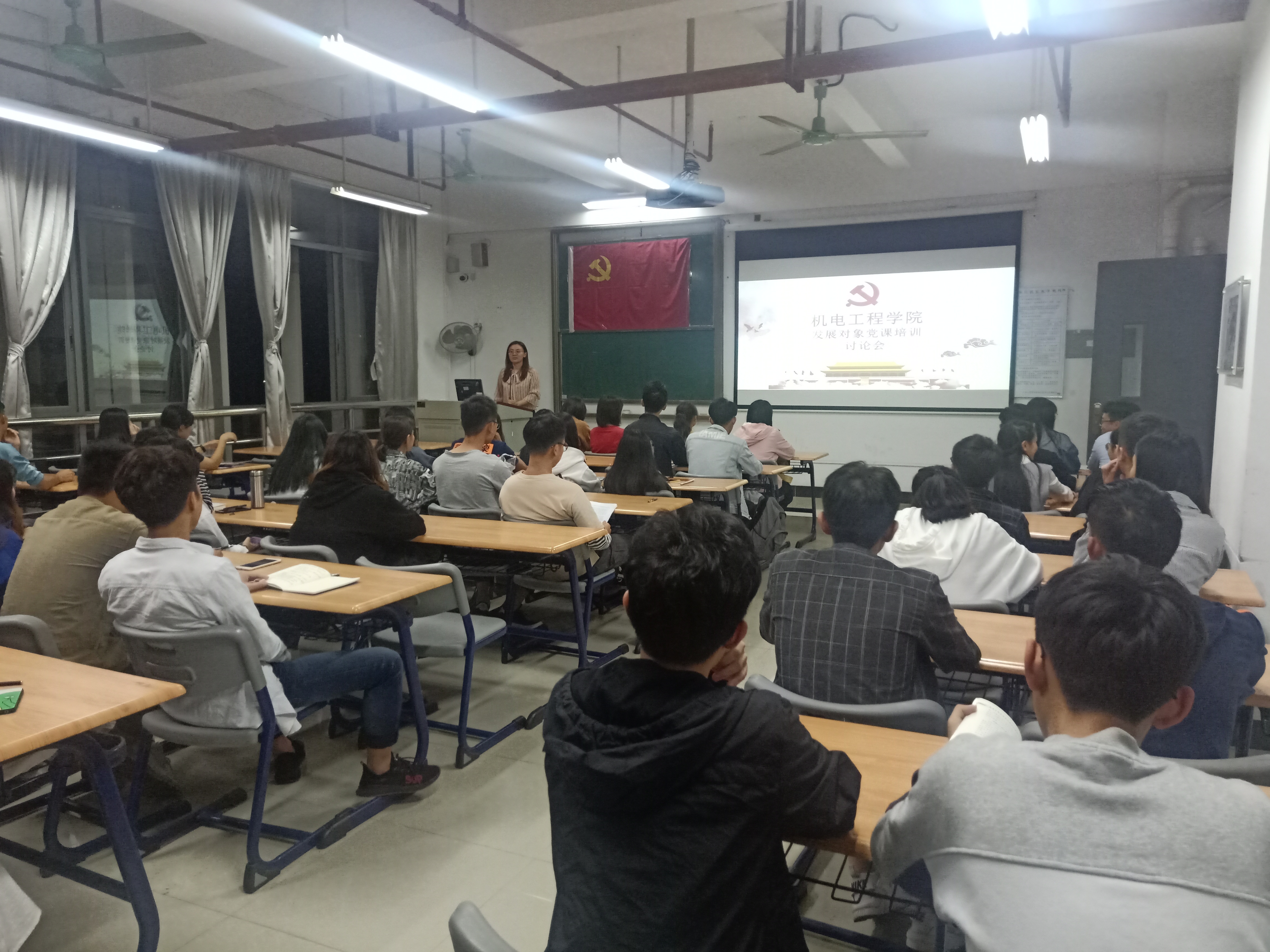 2019年11月9日晚上19:00,机电工程学院学生党支部于明德楼1-311召开发展对象党课培训讨论会。本次活动由机电工程学院学生第一党支部书记李慧颖主持,参会人员有参与此次党课培训的全部52名发展对象。