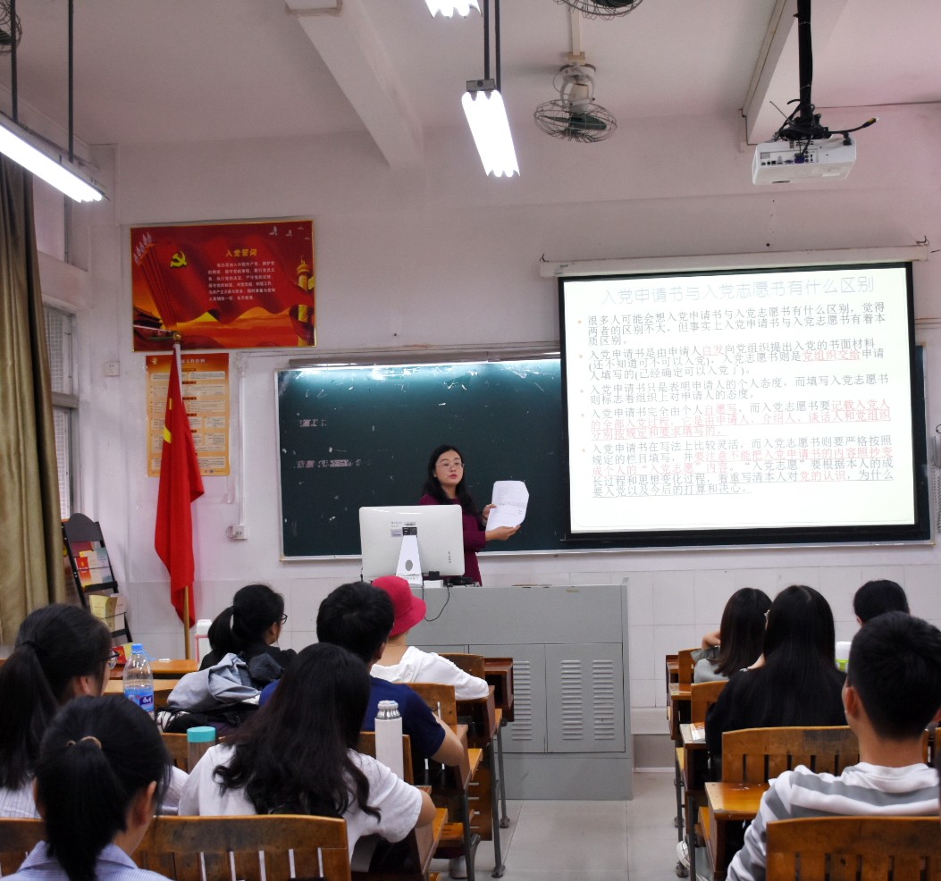 为深入贯彻落实《中国共产党发展党员工作细则》,做好党员发展工作,进一步提高发展对象的思想政治觉悟,坚定共产主义理想信念,端正入党动机,严格党员发展工作程序,保障党员发展质量,11月12日下午,计算机与信息工程学院党总支副书记张艳在天河校区教学楼103课室为天河校区2019年第二期发展对象进行入党志愿书填写培训。