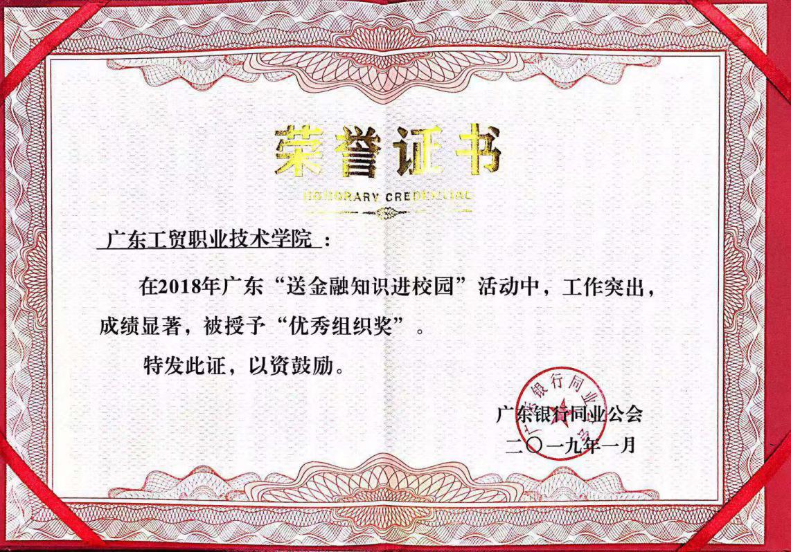 我校在广东省教育厅、广东银保监会、广东银行同业公会组织开展的2018年“送金融知识进校园”系列活动中因工作突出、组织到位、教育效果显著荣获“优秀组织奖”。