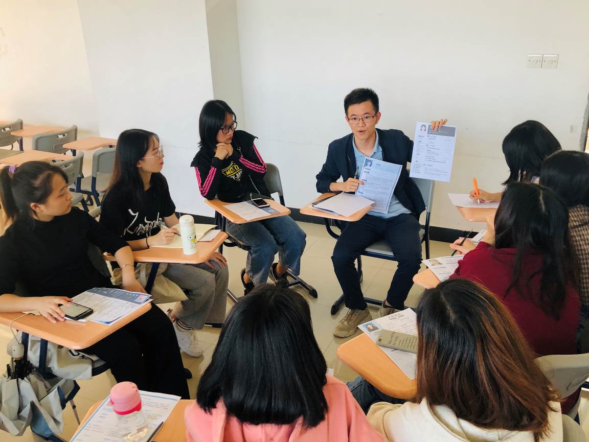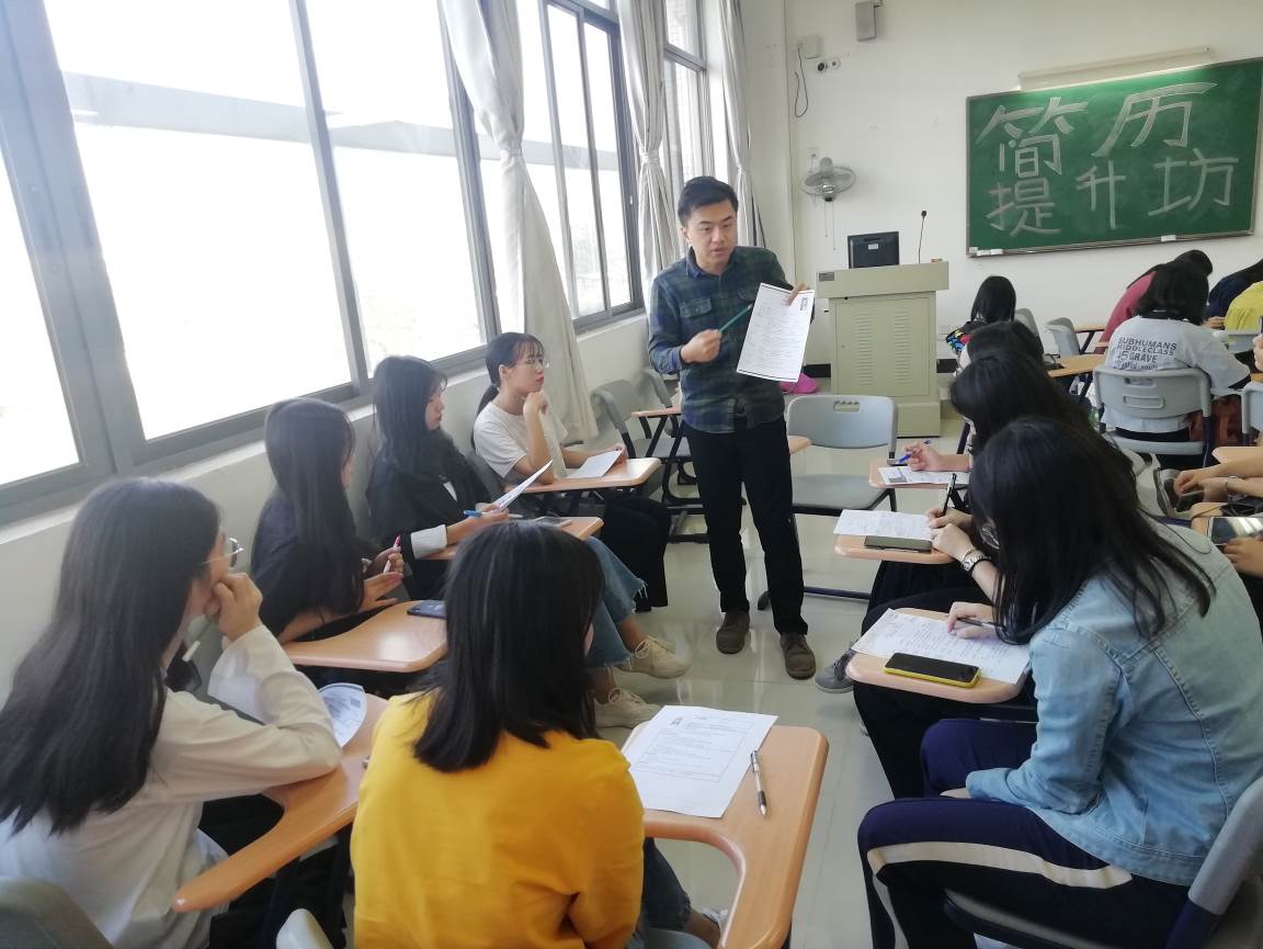 为贯彻落实2020届全国普通高校毕业生就业创业工作网络视频会议精神,进一步有效提升学生的求职简历水平,加强就业指导精准化,11月14日下午,应用外语学院在明德楼1区617和618开展“简历提升坊”活动。活动邀请林耀佳、陈晓玲、王燕玲、刘婵、冯锐骐和李迪等多名职业指导师或就业指导课任课教师,以围圈小组工作坊的模式,为进入应用外语学院第三届简历大赛复赛的60余名选手开展面对面的精准指导和服务。