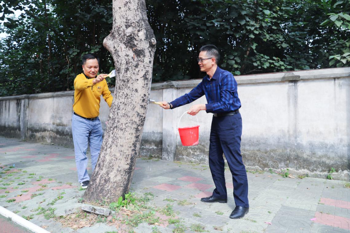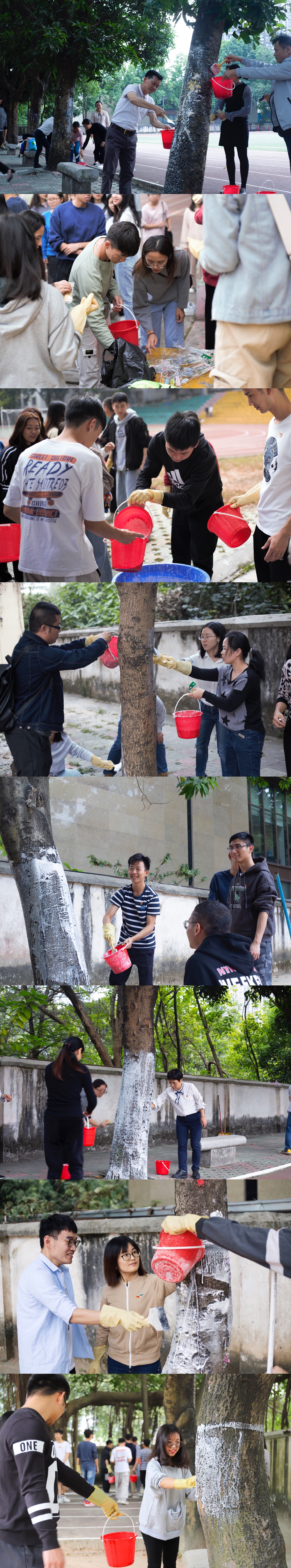 随着二十四节气中的“立冬”来临,广州进入了寒意袭人的初冬时节。天气越来越冷,在人们纷纷换上冬装的同时,计算机学院党总支的党员同志们给天河校区东区足球场的树木也换上了一层“新冬装”。“我们为树木换上的这件‘冬装’是由石灰、硫磺粉等混合而成。穿上它,既可减少树木向阳外皮部因昼夜温差过大而受到伤害,还能阻断一些越冬的病虫害,使林木顺利过冬,以此达到防冻、防虫、杀菌的目的。”计算机学院党总支书记张宁告诉在场的师生党员。为确保做到涂白的高度统一、均匀,党员同志们将树干刷白高度统一控制在离地1.5米左右,做到上下一致,整齐均匀。