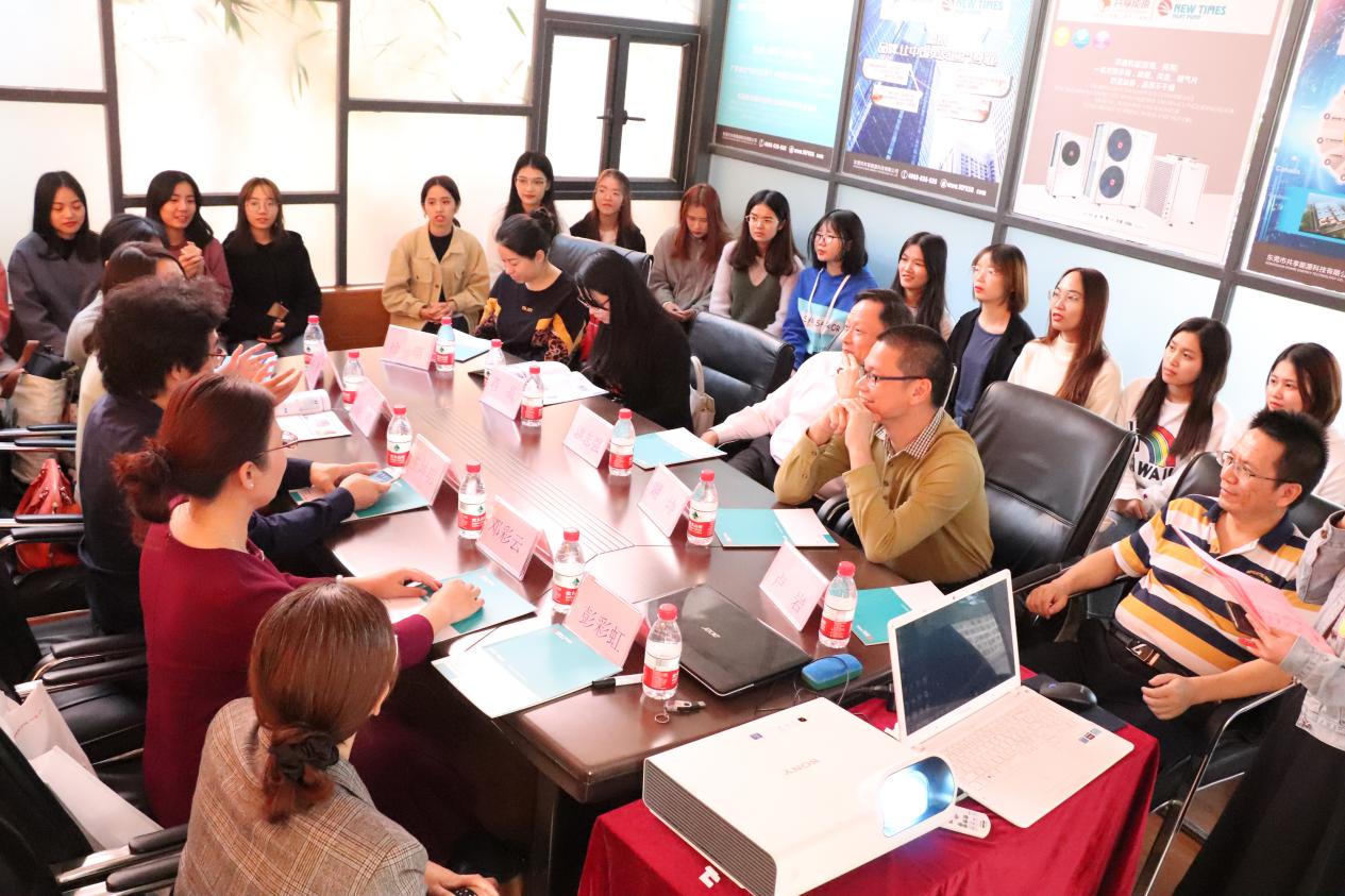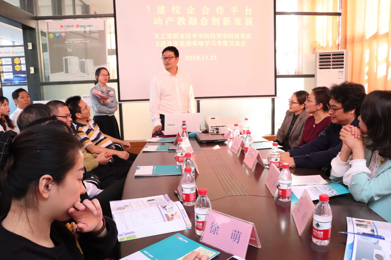 20191121日下午,经济贸易学院党总支副书记王坤明、副院长方洁、商贸系主任蒋晶办公室主任邓彩云、骨干教师张莉、卢岩徐萌、彭彩虹,以及经济贸易学院18级国际经济与贸易专业部分学生,到东莞共享能源科技有限公司广州外贸部,深入开展校企合作教育和实践活动。