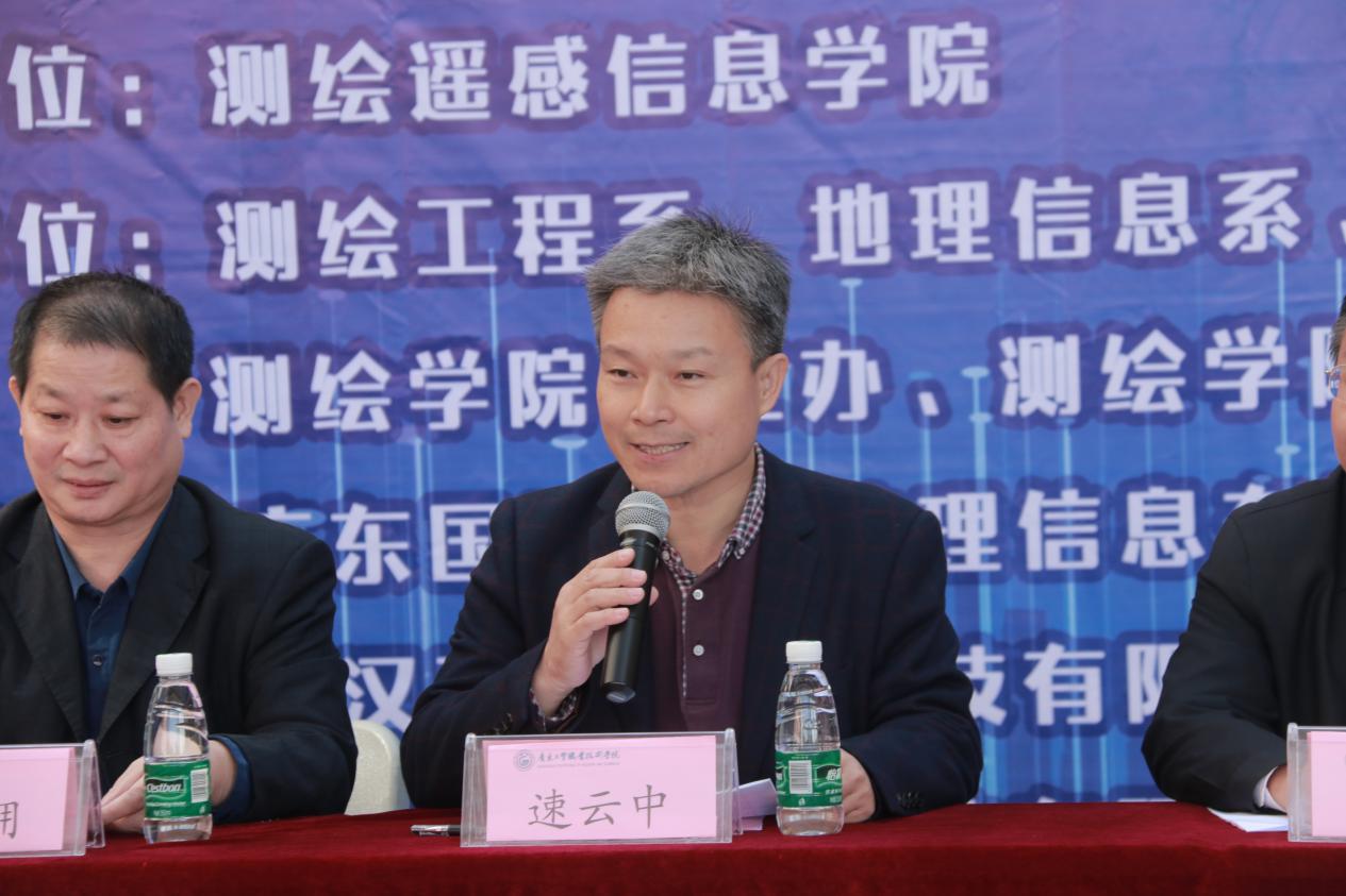 莅临现场的领导嘉宾有广东国图勘测地理信息有限公司总经理孙超,武汉天宝耐特科技有限公司董事长禹良先生,上海华测导航技术股份有限公司广东分公司总经理李东兵,广州天派空间科技有限公司总经理郭贵平,广州南方测绘科技股份有限公司广州分公司副总经理满永利,广州一飞航空科技有限公司执行董事、总经理高阳,广州宏拓测量仪器有限公司经理曾令鑫先生,学校科研处处长何军拥,对外交流合作处处长黎明虹,测绘遥感信息学院党总支书记兼院长速云中,测绘遥感信息学院副院长李益强、测绘遥感信息学院党总支副书记李元。