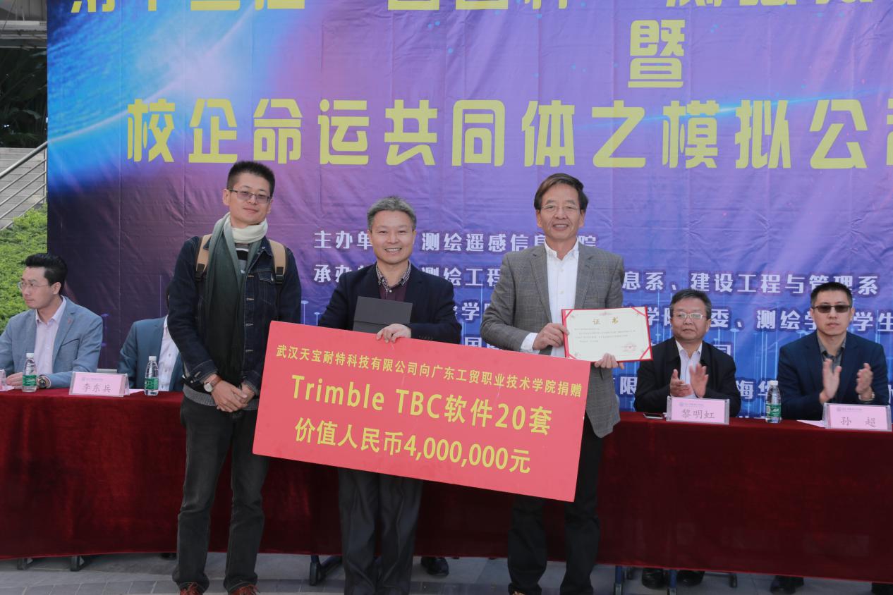 随后,武汉天宝耐特科技有限公司禹良先生代表公司向我校捐赠价值400万元整的 Trimble TBC软件20套,速云中代表学校回赠了捐赠证书。广州天派空间科技有限公司总经理郭贵平代表公司向我校捐赠价值人民币24万元整的Trimble ZX5 无人机1台,李益强代表学校回赠了捐赠证书。上海华测导航技术股份有限公司广东分公司总经理李东兵代表公司向我校捐赠价值人民币10万元整的激光点云测绘成图软件Cosurvey共2套,李元代表学校回赠了捐赠证书。