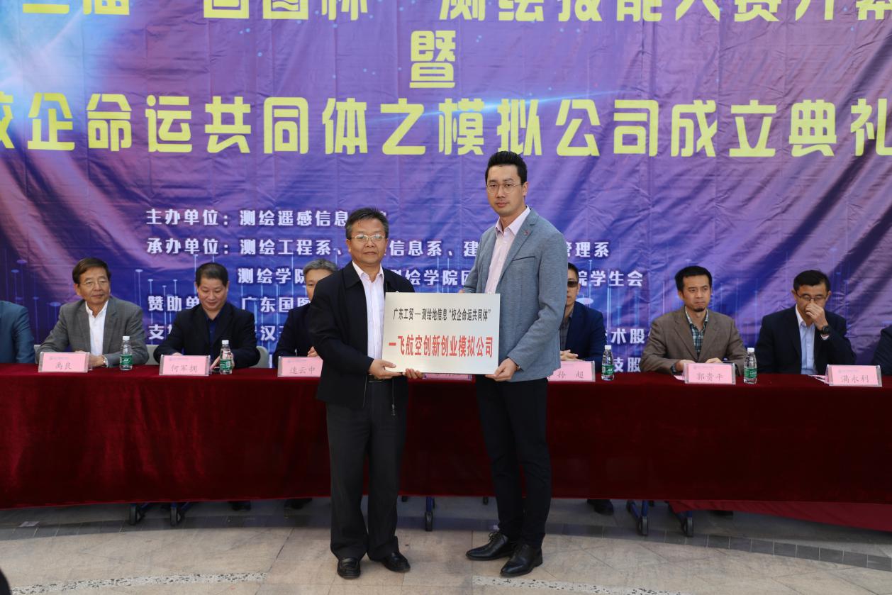 接着,何军拥、黎明虹为武汉天宝耐特科技有限公司、上海华测导航技术股份有限公司广东分公司、广州天派空间科技有限公司、广州南方测绘科技股份有限公司广州分公司、广州一飞航空科技有限公司、广州宏拓测量仪器有限公司授予广东工贸-测绘地理信息校企命运共同体之模拟公司牌匾。