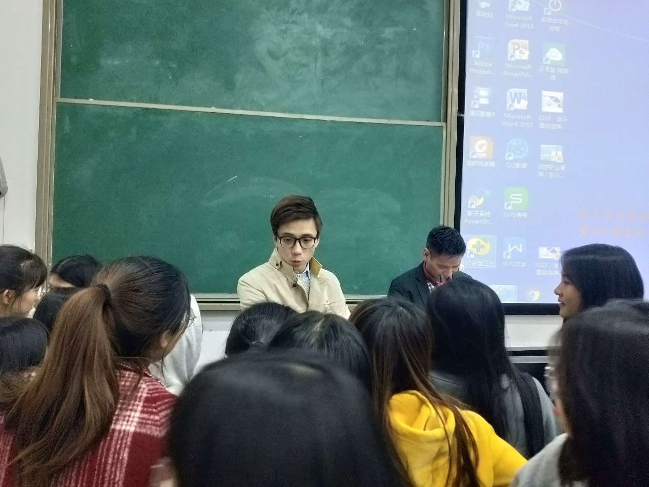 126,应用外语学院旅游英语专业举办一场“旅游行业发展概况及其人才需求”知识讲座受院党总支副书记罗春科邀请旅英专业2010届毕业生彭兆熙到校为我院18级、19旅英专业同学做主题讲座