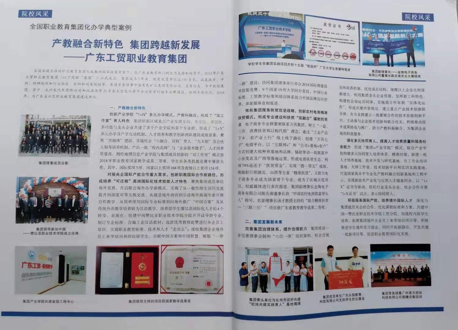 中华人民共和国教育部主管的《中国职业技术教育》于2019年第33期在全国职业教育集团化办学典型案例中刊发了题为“产教融合新特色 集团跨越新发展——广东工贸职业教育集团”一文。