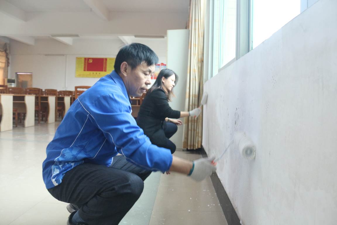 接着,全体师生党员到达钟落潭镇湴湖村老人活动中心,美化活动迅速开展。大家有的刷墙、有的清扫、有的拖地、有的贴字,忙得不亦乐乎,充分展现了一名党员对服务群众的热心和实干精神。经过一个下午的劳动,老人活动中心焕然一新。