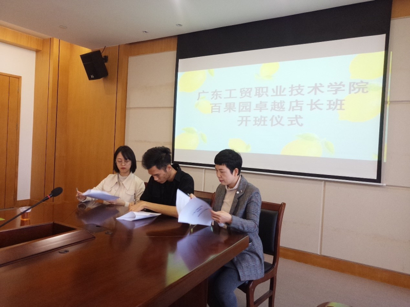 20191226日,广东工贸工商管理学院百果园卓越店长班开班仪式在明德楼1201中心会议室举行。参加此次开班仪式有工商管理学院党总支书记周清莲,副书记谢宏祥,工商管理学院副院长倪春丽,商业服务系主任何美贤、财税服务系主任邹建军、企业管理专业带头人袁年英、商务管理教师黄淑雯,以及百果园人力资源部副经理纪楚珊、人力资源部人事主管梁仲麟,参加讲座的学生共有16人。倪春丽担任本次仪式的主持并宣布卓越店长班开班仪式正式开始。