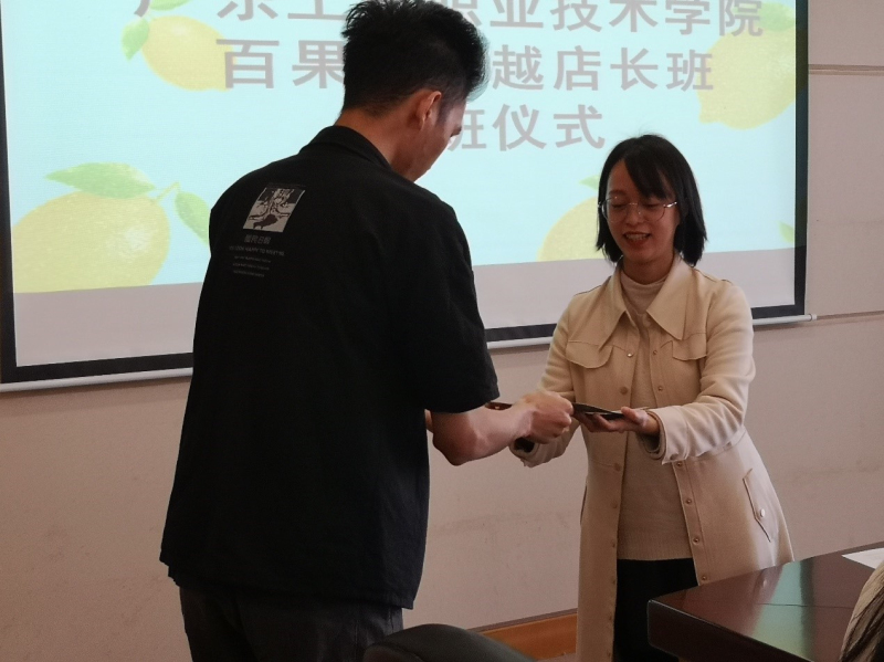 仪式上,先由百果园企业代表纪楚珊发表讲话,她用百果园新上市的招牌“红芭蕾”草莓来寓意卓越店长班的同学们也如草莓一样新鲜出炉般,与百果园一同成长、一同进步。纪楚珊代表表示未来将不断深化与我院的联系和对接,探讨多层次的合作模式,期待校企合作之花盛开,结出更多丰硕成果。并且向12位同学发放录用通知书。