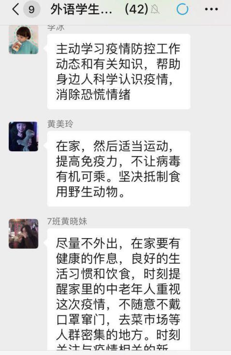 疫情就是集结号,一个党支部就是一个堡垒。在新冠肺炎疫情防控形势依然严峻的形势下,应用外语学院学生第一党支部党课“不断档”与当前的主要任务紧密结合,党支部书记陈晓玲通过支部微信群开展了一次主题为“疫情当前,我们大学生党员能做什么”的线上微党课教育活动与全体党员分享了看法,呼吁学生党员们在保护自己的同时积极承担社会责任。