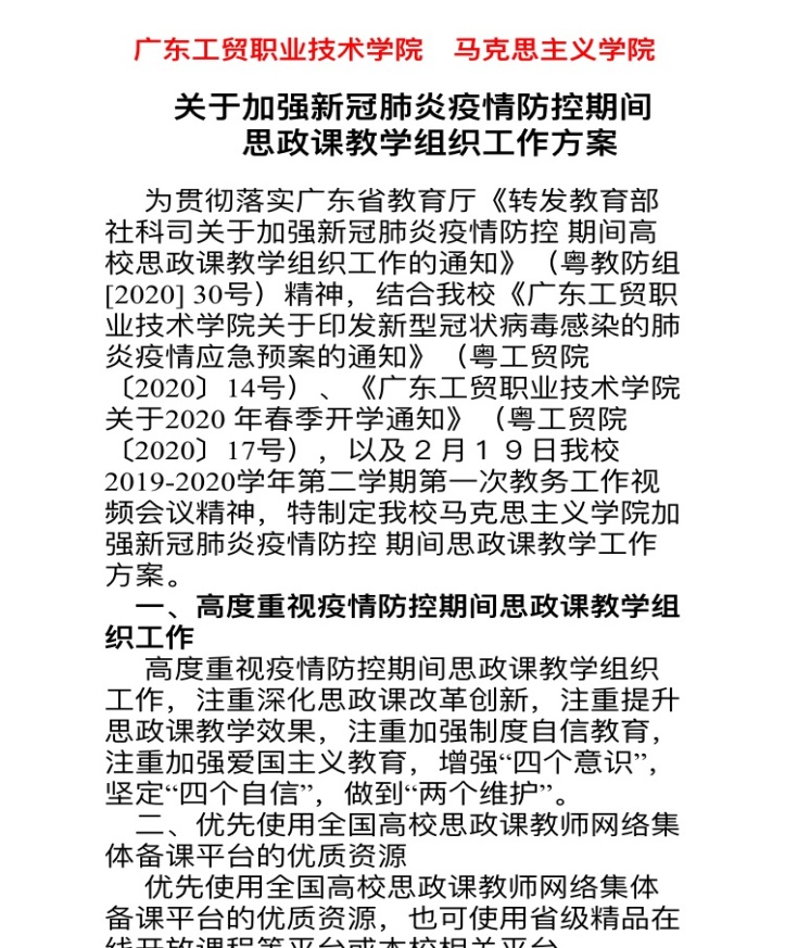 马克思主义学院认真贯彻落实广东省教育厅和我校疫情应急预案的一系列通知精神,结合2月19日我校2019-2020学年第二学期第一次教务工作视频会议精神,严格加强新冠肺炎疫情防控期间思政课教学工作组织工作,制定了我校马院《关于加强新冠肺炎疫情防控期间思政课教学组织工作方案》,千方百计协助老师解决线上教学存在的资源、技术、平台等问题,通过部门微信群,及时发布一些与疫情防控有关的国家政策、疫情防控指导知识、线上教学窍门等资源,引导思政教师注重提升思政课教学效果,注重加强制度自信教育,注重加强爱国主义教育,增强“四个意识”、坚定“四个自信”、做到“两个维护”。