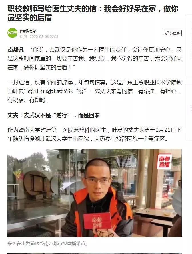 南方都市报发表文章《职教教师写给医生丈夫的信:我会好好待在家,做你的坚强后盾》