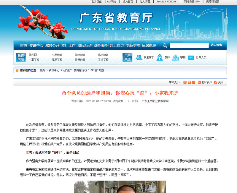 教育厅主页网抗“疫”典型栏目发表文章《《两个党员的选择与担当:你安心抗“疫”,小家我来护》》