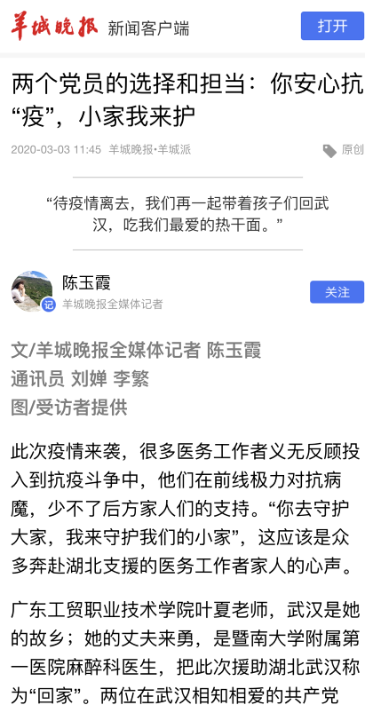 羊城晚报发表文章《两个党员的选择与担当:你安心抗“疫”,小家我来护》
