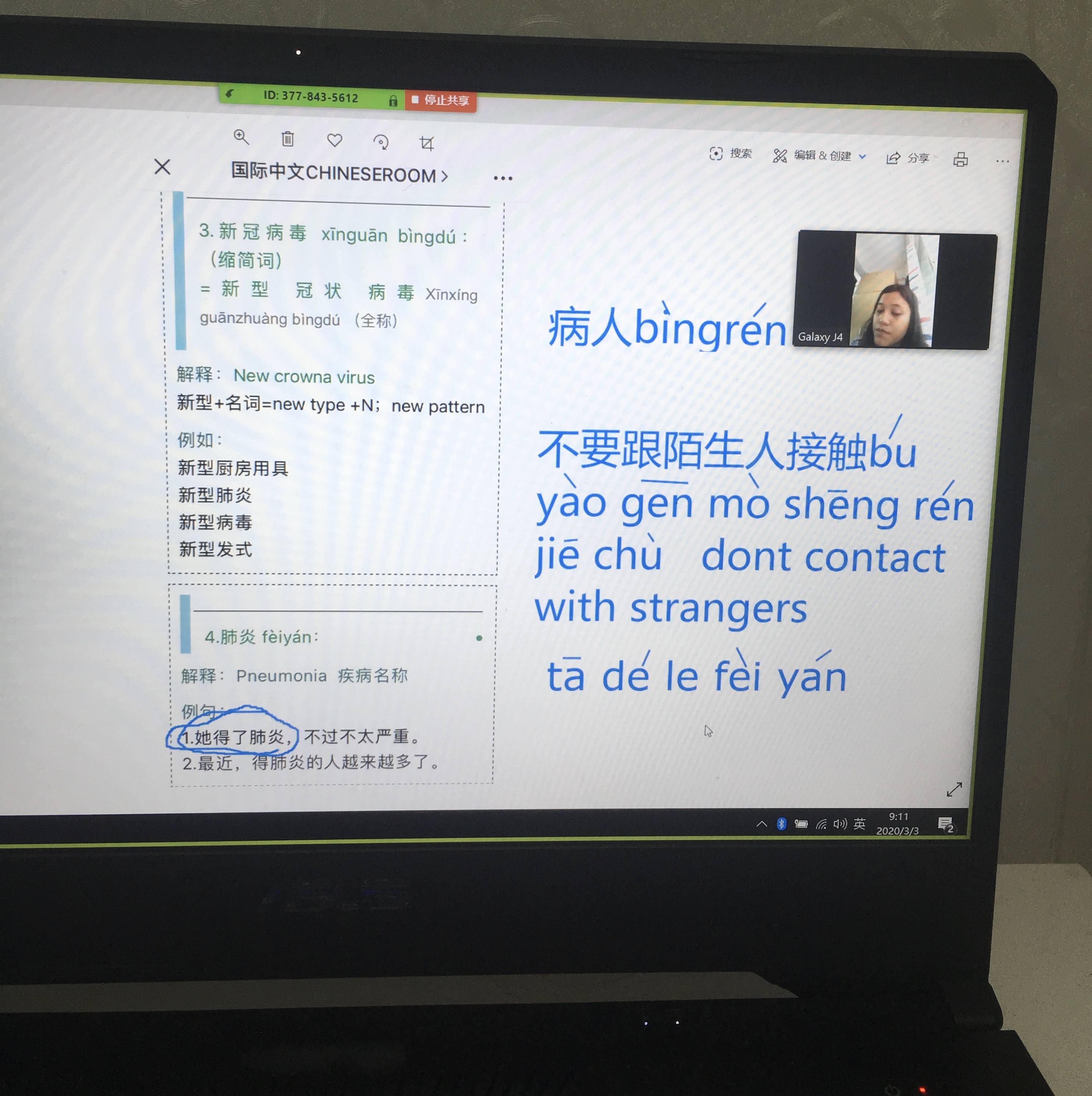 2020年春季第一课通过zoom软件进行学习。课堂上,老师向学生介绍新型冠状病毒的最新进展情况及防护措施,嘱咐留学生们做好安全防护。接下来,借助课件进行汉语听、说、读、写的专项练习。