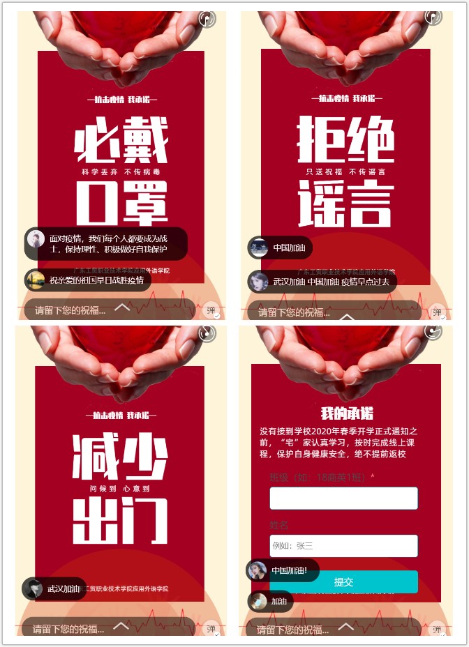 校学生会发起“我们是工贸学子,我们共同承诺”承诺活动,号召全校学子合理安排时间,在家多读书、多学习;勤洗手、戴口罩,注意个人卫生;不串门、不聚集,见屏如面传心意;不造谣、不传谣、不信谣;坚决向野味说“不”;诚实守信,如实报告个人情况;听从学校安排,不提前返校;听党话、跟党走,共克时艰,打赢战“疫”。单篇维文阅读量一小时内突破2万,总阅读量达到3