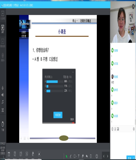 魏湘辉:第一次直播感觉像打仗,虽然了准备了很久,但还是状况百出,包括平台网络都有意想不到的问题。还好,同学们很支持,早上8点的课程到课率也很满,看到同学们都在讨论区积极发言,全程直播的苦与累也都烟消云散了。