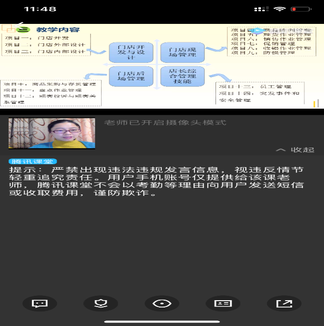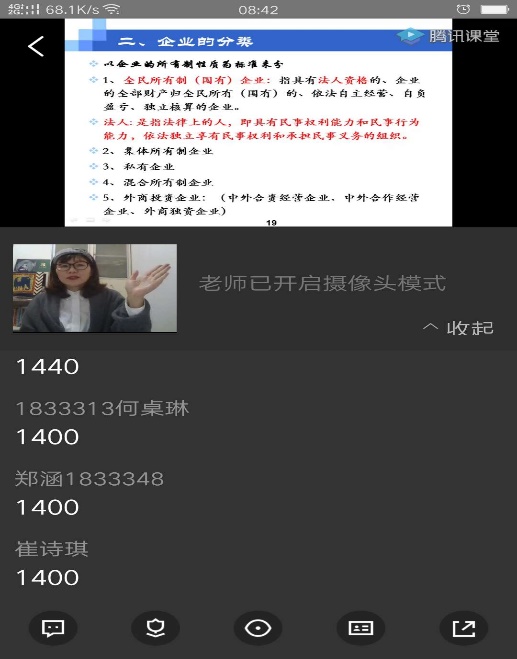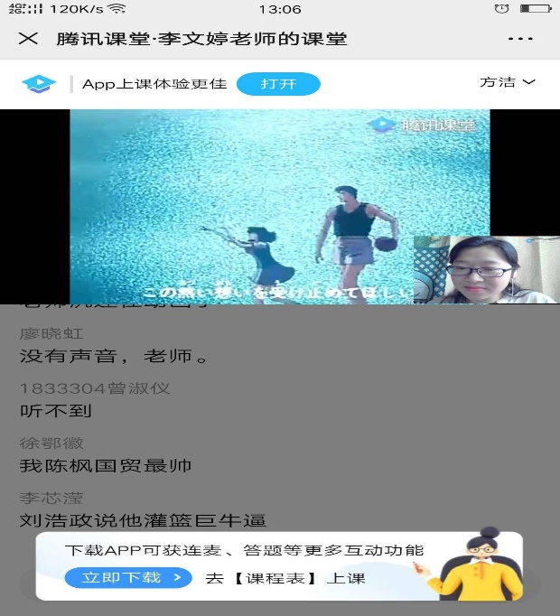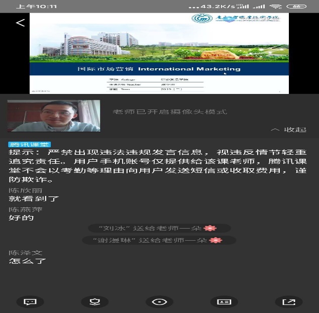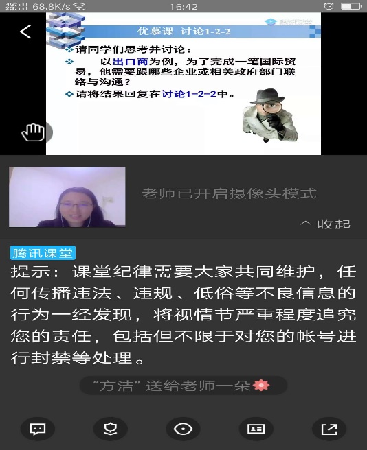 徐添添:同学们第一周对于这种新的课程模式还是感到兴奋的,基本上都能积极参与。调整课表后有些同学周四开始六节课连上会有一些疲惫,课堂直播的互动就不太好进行。所以还是要和优慕课平台一起结合使用,受网络影响,有些学生反应视频会有卡顿。