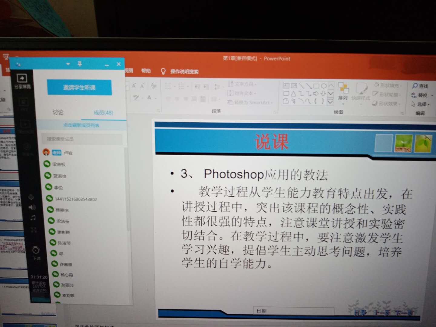 廖文芳:刚开始,一切都很顺利,课件PPT,视频,声音,光线,画面,完美,然后讲着讲着,有同学在讨论区反映,老师,有点卡哦。