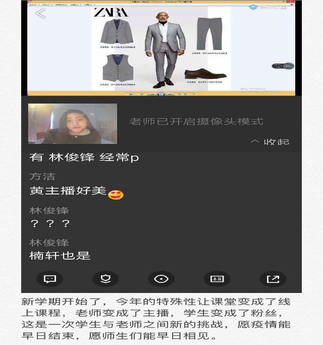 黄卉:新学期开始了,今年的特殊性让课堂变成了线上课程,老师变成了主播,学生变成了粉丝,这是一次学生与老师之间新的挑战,愿疫情能早日结束,愿师生们能早日相见。