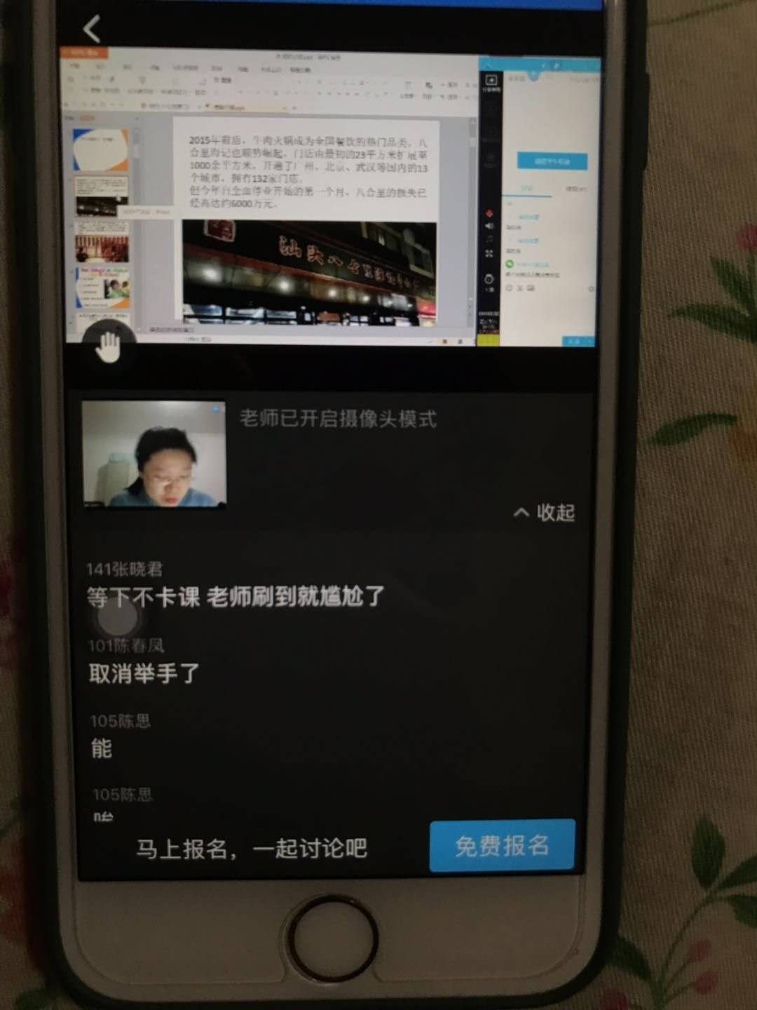梁艳:第一次网课,瞬间让我找回了第一次上讲台的感觉,紧张、忐忑,还夹杂着丝丝的兴奋,就这样在十八线女主播的道路上起步了,对着屏幕的自己上课感觉就像自己唱着独角戏,no,no,no,原来可爱的你们一直躲在幕后打call。