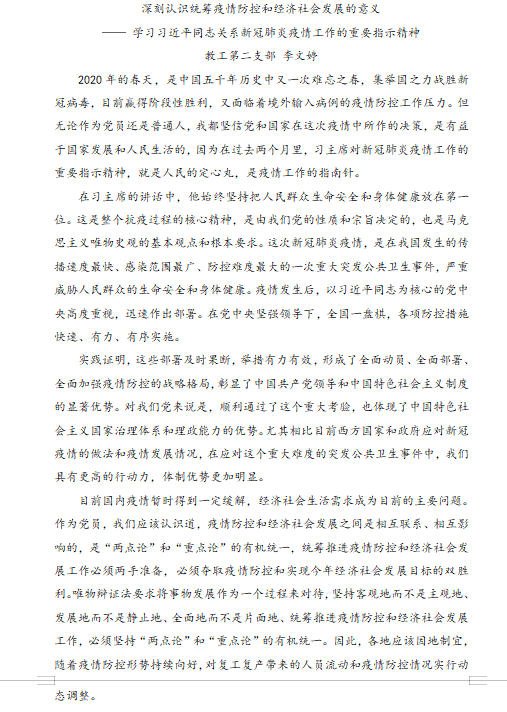 疫情防控期间,支部在强调党员教师做好个人防控,线上教学本职工作的同时,也不松懈于党员政治学习。3月24日-28日期间,蒋晶向支部党员传达了学校《新冠肺炎防控学习通知》,并发布支部政治学习内容清单。支部党员纷纷响应,在家开展政治学习,并撰写学习心得。