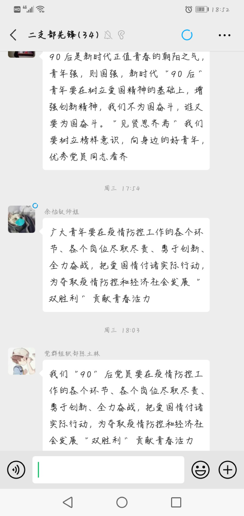 全体党员利用“学习强国”平台通读学习了习近平总书记的回信和抗疫战争中不断涌现的“90后”党员的英勇事迹;随后,大家根据自身实际发言,纷纷表示要学习优秀党员精神品质,要“在为人民服务中茁壮成长,在艰苦奋斗中砥砺意志品质、在实践中增长工作本领”。