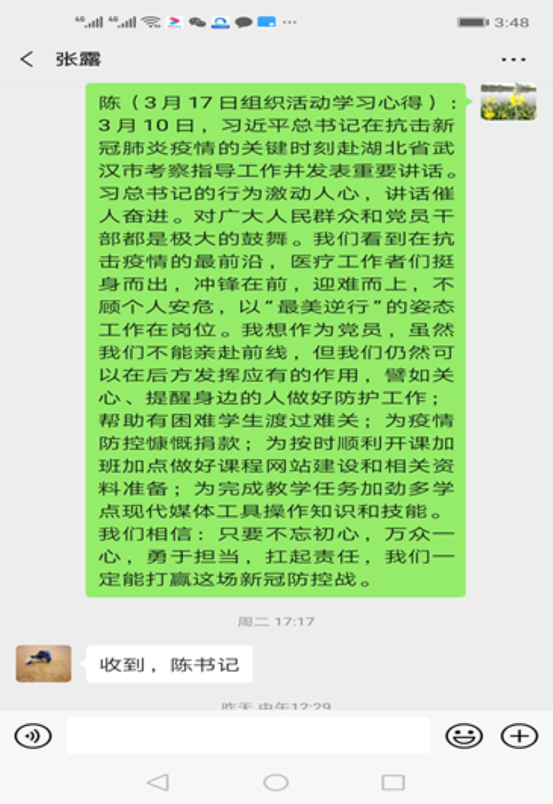 支委党员肖晓峰结合自己的实际情况,感受到了中国的强大,认为作为党员应该配合学校安排好的学习,清楚自己的责任与担当。支委党员韩天瑶对于本次疫情也是感触良多,结合自己在疫情期间的工作、生活中的经历,从自己“催学生采集数据”到“政府部门多次了解自己的状况”中表示对基层工作的理解,自己要以身作则的去配合学生的工作。学生党员也分享了自己在疫情期间是经历与感受此前,党支部响应号召进行两次捐款共1509.88元,此前不少党员已经通过各种网络平台捐款1140元。。