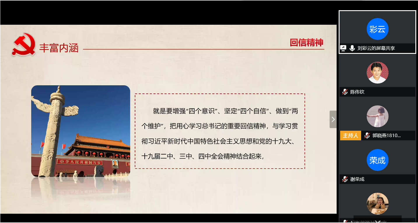 会议上,刘彩云对回信的内涵进行了讲解,介绍了当前由教育部启动全国高校学习习近平总书记重要回信精神“@大接龙”活动,并针对此次学习对支部全体党员提出了几点要求。全国高校学习习近平总书记重要回信精神“@大接龙”活动掀起了学习贯彻习近平总书记重要回信精神的学习热潮,形成不同高校“同学习、齐分享、共实践”的生动局面。我们要继续将这份精神更好的传递下去,营造好氛围,切实把总书记的重要回信精神转化为扎实行动,不断增强维护国家统一、民族团结和社会稳定的自觉性,深入践行社会主义核心价值观,把青春绽放在党和人民最需要的地方。