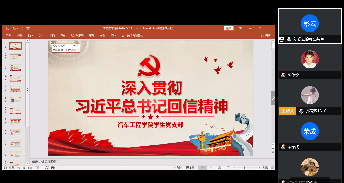 为深入学习贯彻习近平总书记给北京大学援鄂医疗队“90后”党员重要回信精神,号召全体党员弘扬不惧艰险、冲锋在前、奋斗爱国、自强不息的良好精神,2020年4月28日下午,汽车工程学院学生党支部在线上开展“深入贯彻习近平总书记回信精神”专题党课学习活动,此次学习由支部书记刘彩云主讲。