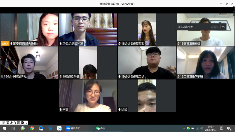 为深入贯彻落实习近平新时代中国特色社会主义思想,扎实推进工商管理学院团员发展和教育工作,充分发挥团组织的教育职能,把培养教育青年一代团员的任务落到实处,培育有理想、有文化、有道德、有纪律的社会主义事业接班人,使我院共青团组织更好成为团结教育全院青年团员的坚强核心。2020年4月27日晚,工商管理学院针对本学期拟发展团员开展了视频团课,主讲人为团委书记李爽,组织部部长冼静雅,副部长钟瀚以及全体拟发展团员参加了本次学习活动。