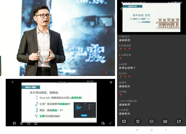 在讲座与互动的提问环节,同学们提出了如何克服上台的胆怯、如何凝聚团队等问题,直播间讨论的氛围热烈,甚至延长了讲座的时长。黄明睿亦与同学们分享他第一次上台的经历,指出需要迈出关键一步,勤加锻炼,方能成长为更好的自己。创业的路演,是学生开始从座位走向讲台,化被动接收到主动输出,是迈出创业这一步的生动展现。