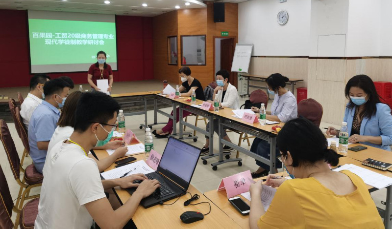 2020年5月21日,工贸-百果园2020级商务管理专业现代学徒制教学研讨会在百果园广州办事处举行。深圳百果园实业(集团)股份有限公司广州区副总经理刘飞、广州区人力资源部经理李进凑、广州区人力资源部行政副经理梁志远、广州区人力资源部培训副经理成丹、广州区培训部培训主管徐进峰、我校工商管理学院副院长倪春丽、商业服务系主任何美贤、商务管理专业教师郑彬、房照、崔聿和黄淑雯参加研讨会。