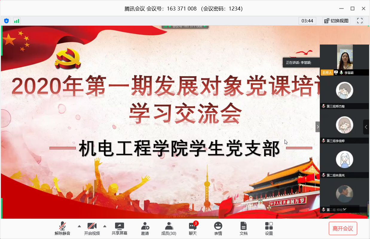 2020年5月20日晚上19:00,机电工程学院学生党支部开展线上2020年第一期发展对象党课培训学习交流会。出席会议的有机电工程学院第一党支部书记李慧颖同志以及27名新鲜血液的发展对象。