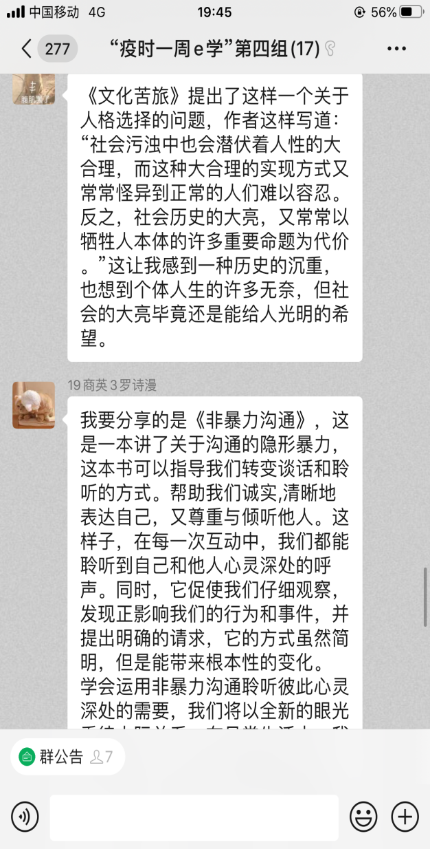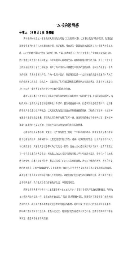 在本次活动中,同学们以线上讨论与写读书心得的形式,将经典好书的时代背景与内容和当代青年的使命担当相结合,就此分享自身心得体会。习近平总书记说过:“读书可以让人保持思想活力,让人得到智慧启发,让人滋养浩然之气”。在疫情期间,我院党员和入党积极分子铭记党的教育,跟随党的指引,读一本好书,分享一本好书,提升个人素质,保持自我的思想活力,滋养自身的浩然之气。在此活动中,同学们纷纷拿起手上的书籍,认真阅读,表达了自己的思想,“少年智则国智,少年富则国富,少年强则国强 ”这句话时时敲打着当代青年。