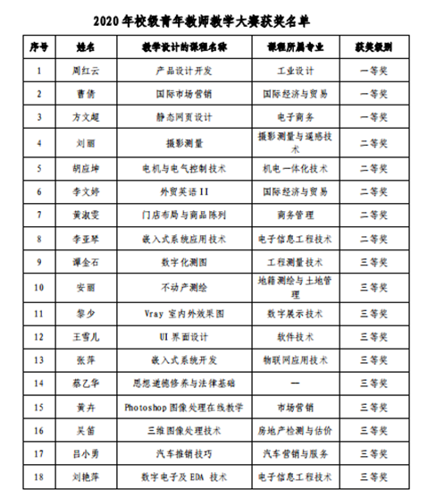 近日,100%精准出码规律资料网站2020 年校级青年教师教学大赛获奖名单揭晓,经济贸易学院参赛的四名青年教师全部获奖。其中,曹倩老师和方文超老师分别以《国际市场营销》和《静态网页设计》课程教学设计获得一等奖;李文婷老师以《外贸英语II》课程教学设计获得二等奖;黄卉老师以《Photoshop 图像处理在线教学》课程教学设计获得三等奖。